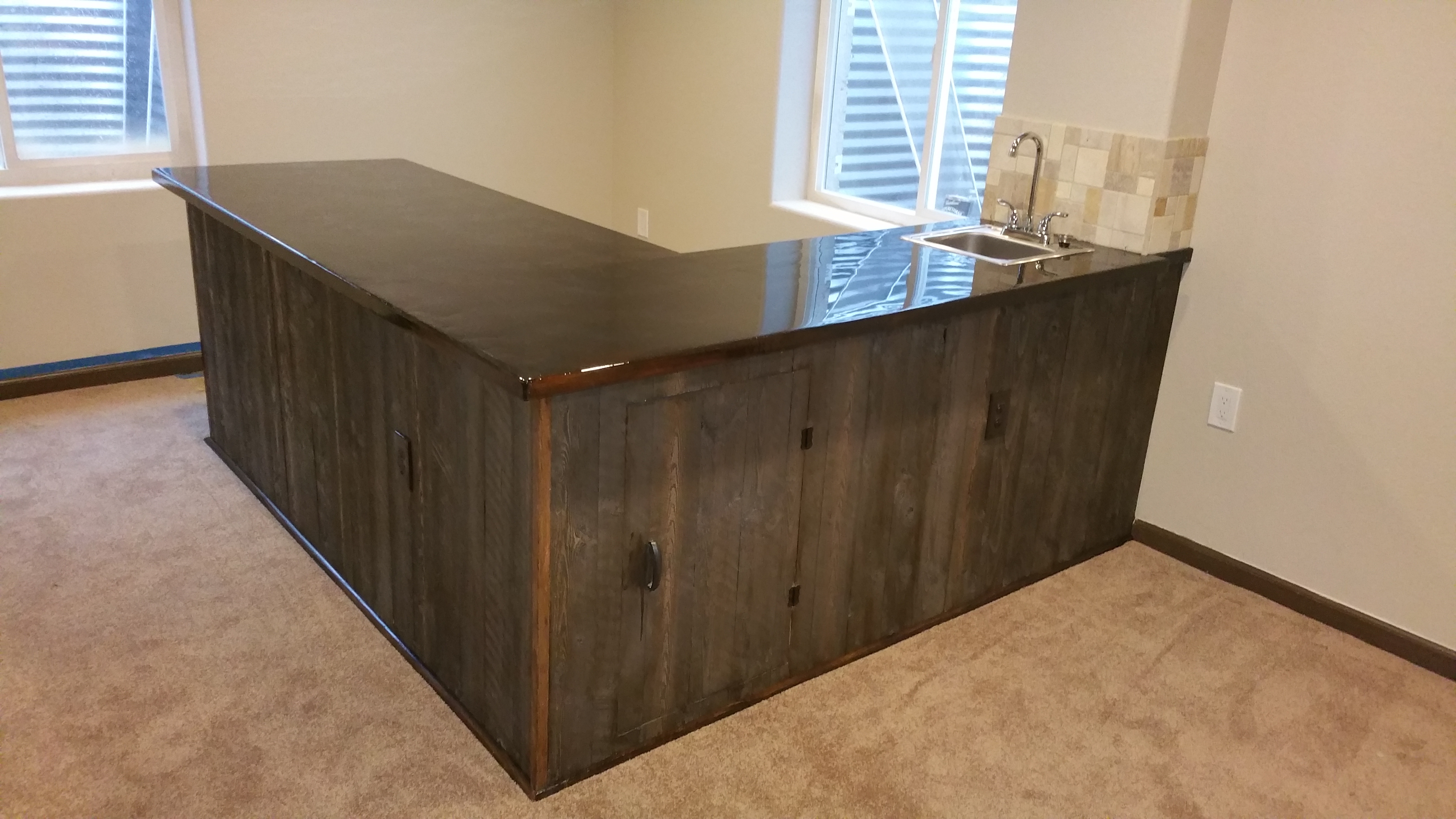 This walls of this bar were built from reclaimed barnwood, while the top is a piece of stained pine veneer plywood with a clear epoxy topcoat for a mirror like finish! A mini sink and fridge were added to make this a fully functional bar space, with added room for storage