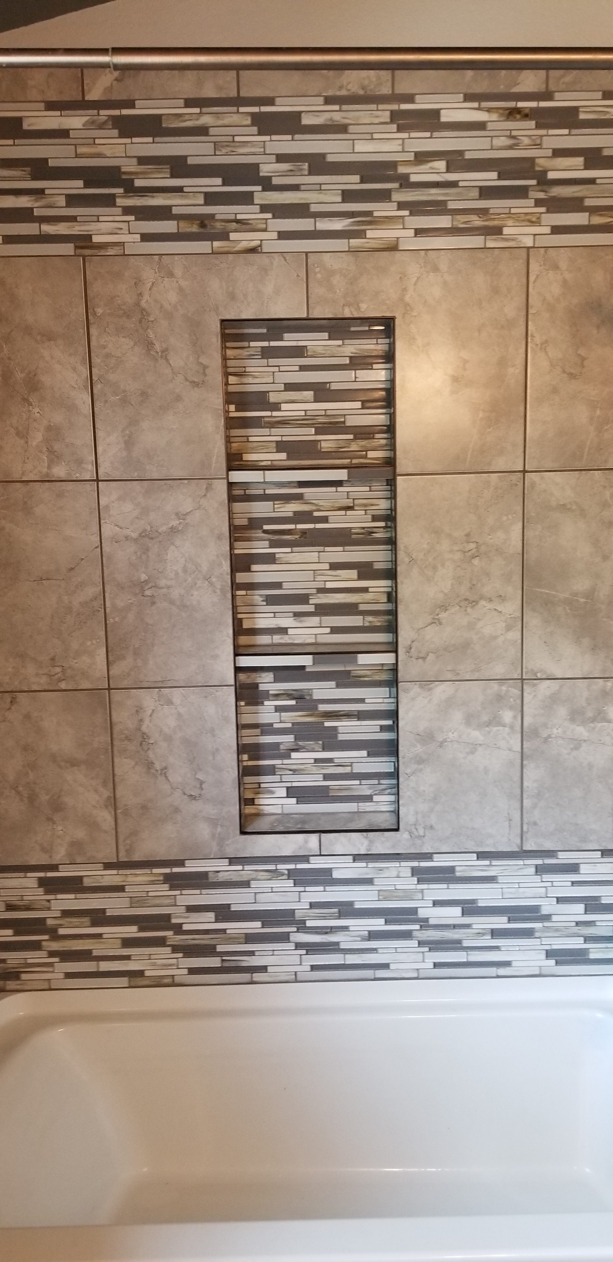 A beautiful new bathtub and tile surround with decorative stone and glass mosaic, and a pocket with built in shelving